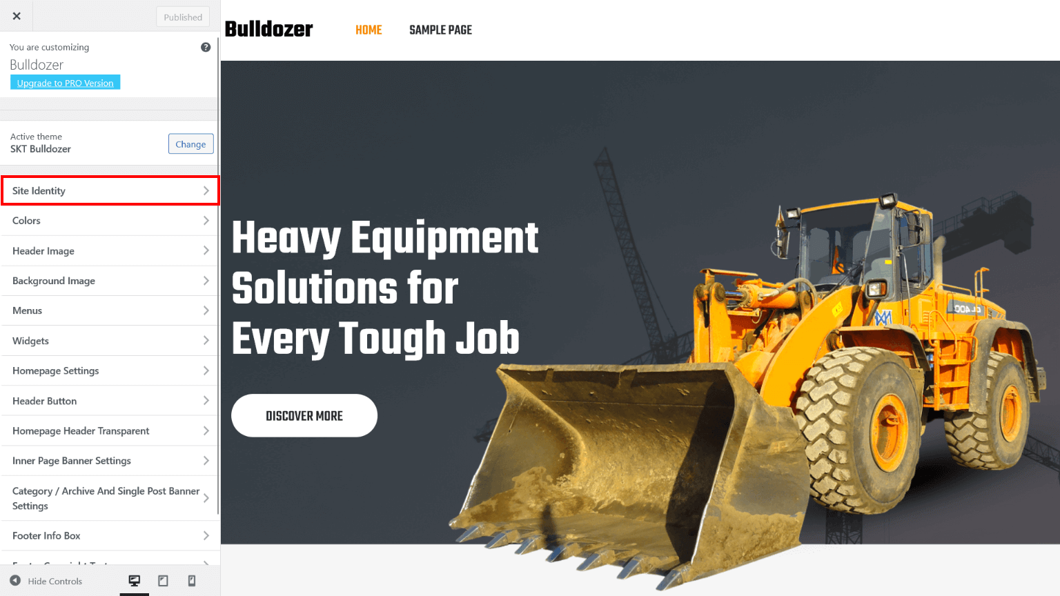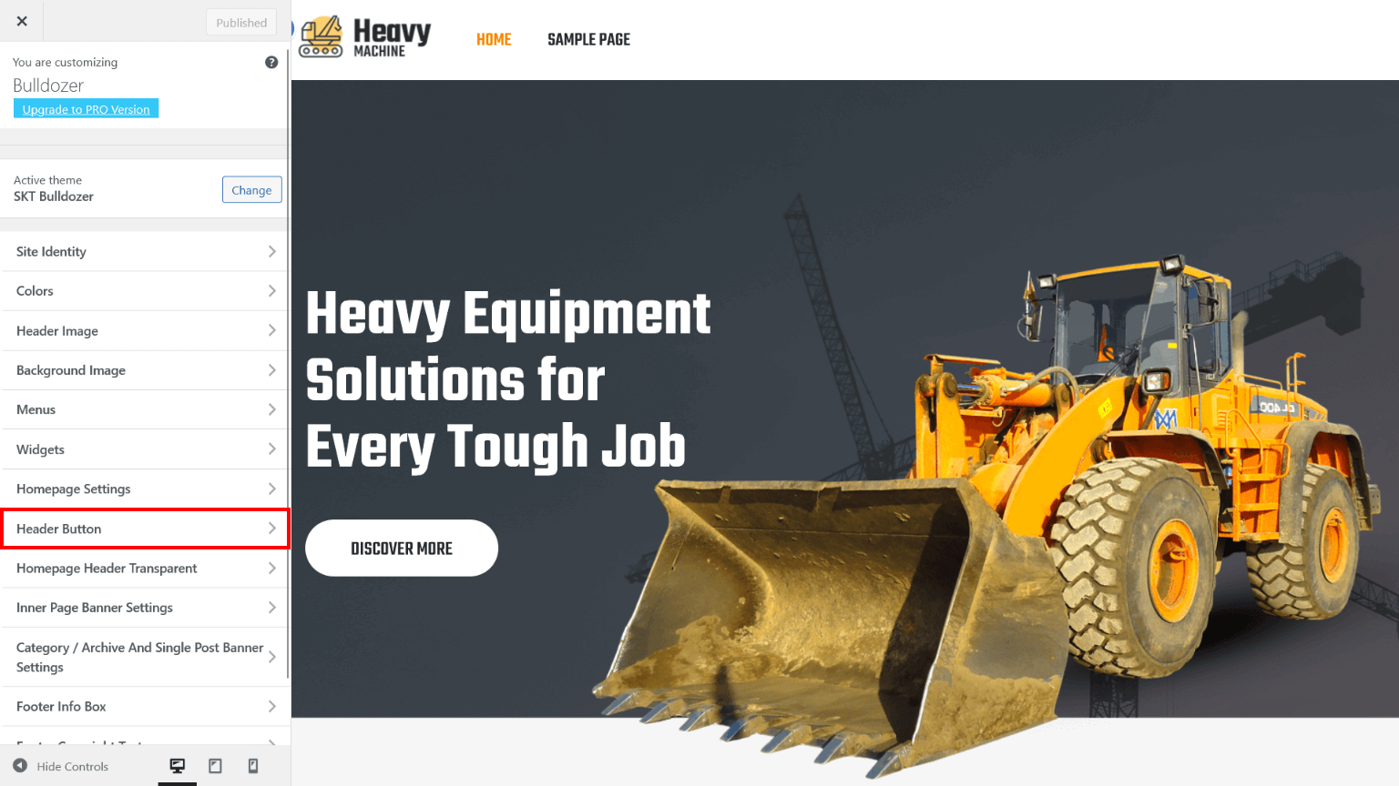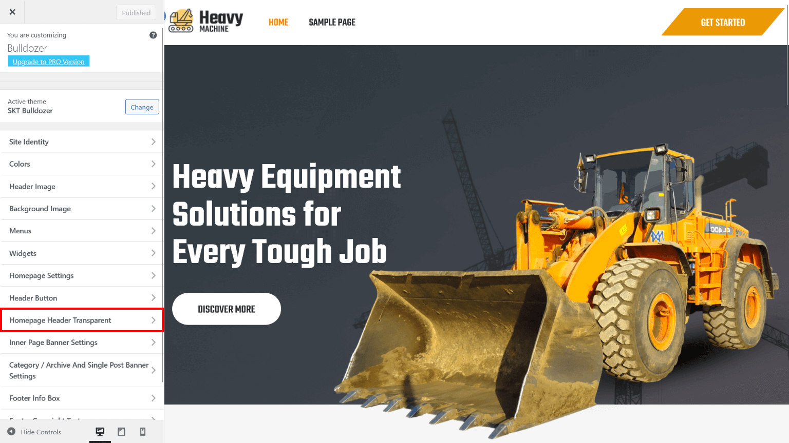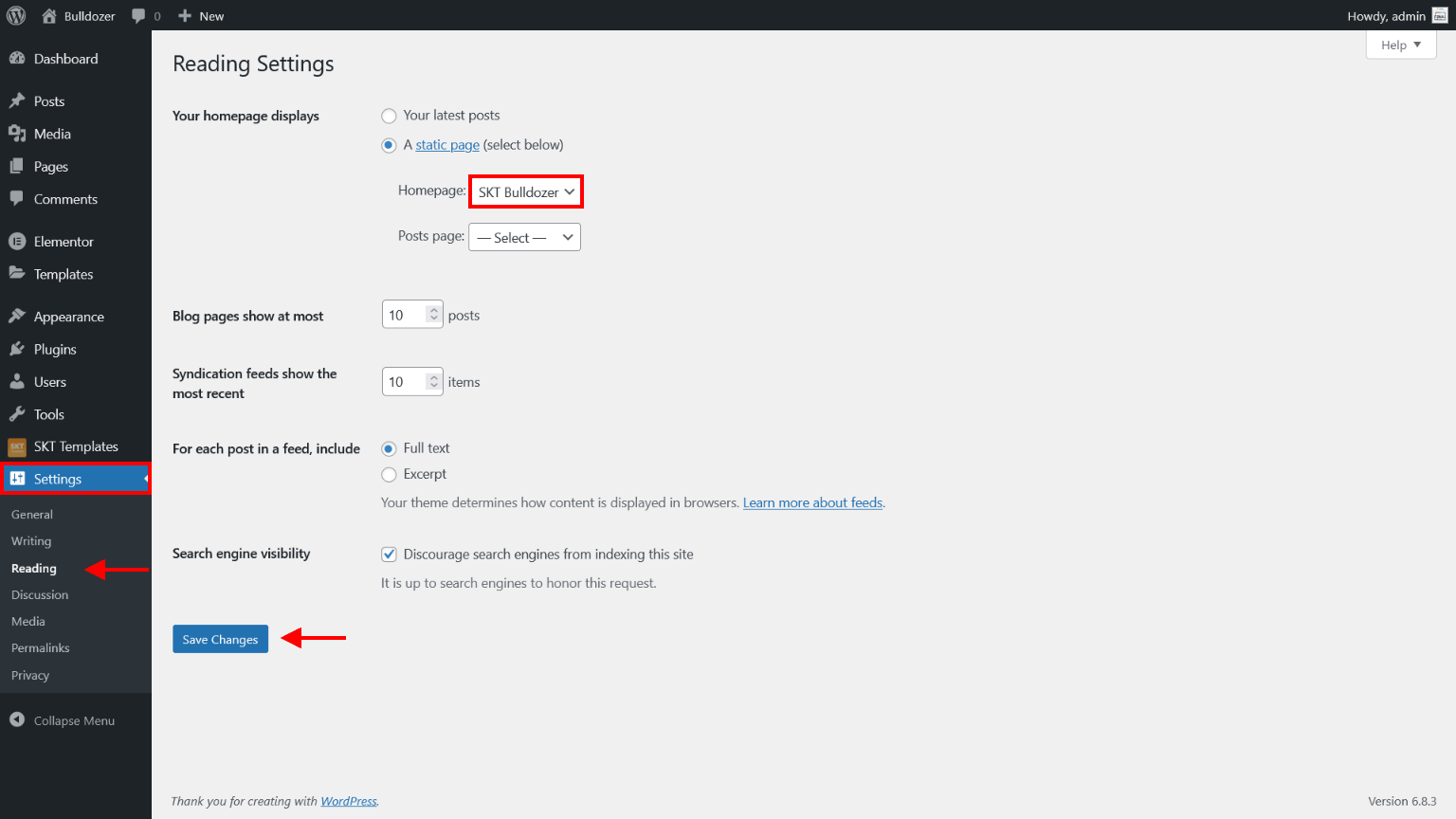 - Now assign imported "SKT Bulldozer" page to static Homepage.