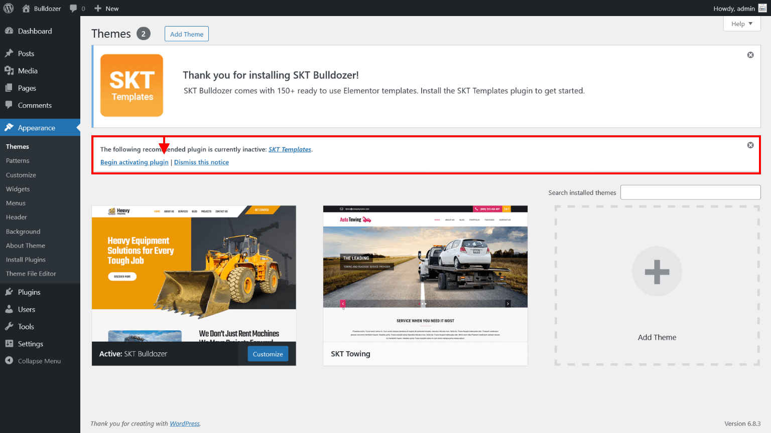 - After activating theme on screen comes "Thank you for installing SKT Bulldozer!" popup message which says "Install the SKT Templates" plugin which is required for theme. So simply click on "Begin installing plugin" and follow further bellow steps.