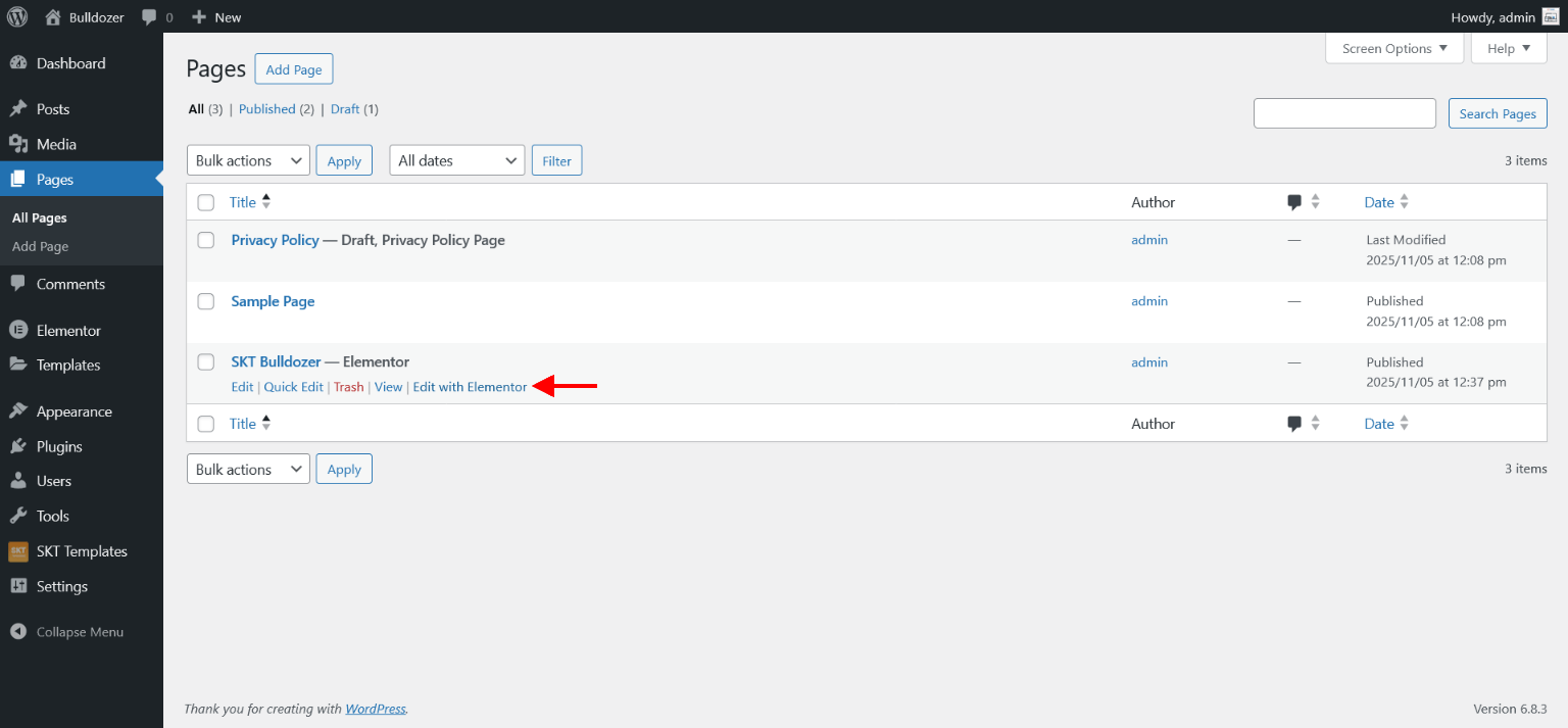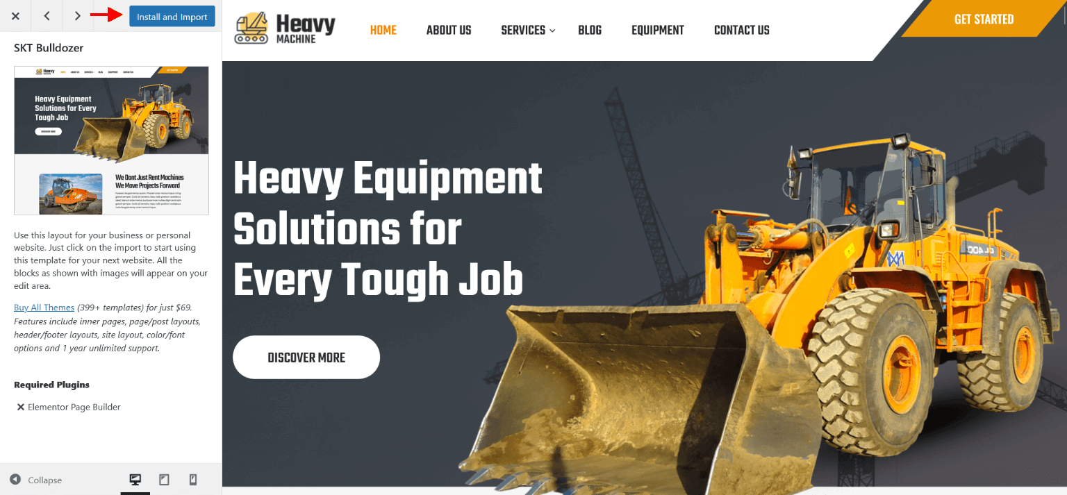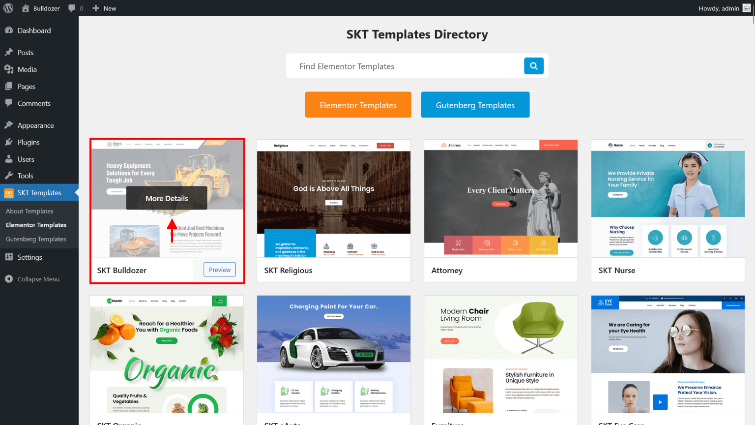 - Now on SKT Templates page simply click on "Elementor Templates" button and going on "SKT Bulldozer" and click on More Details button.
