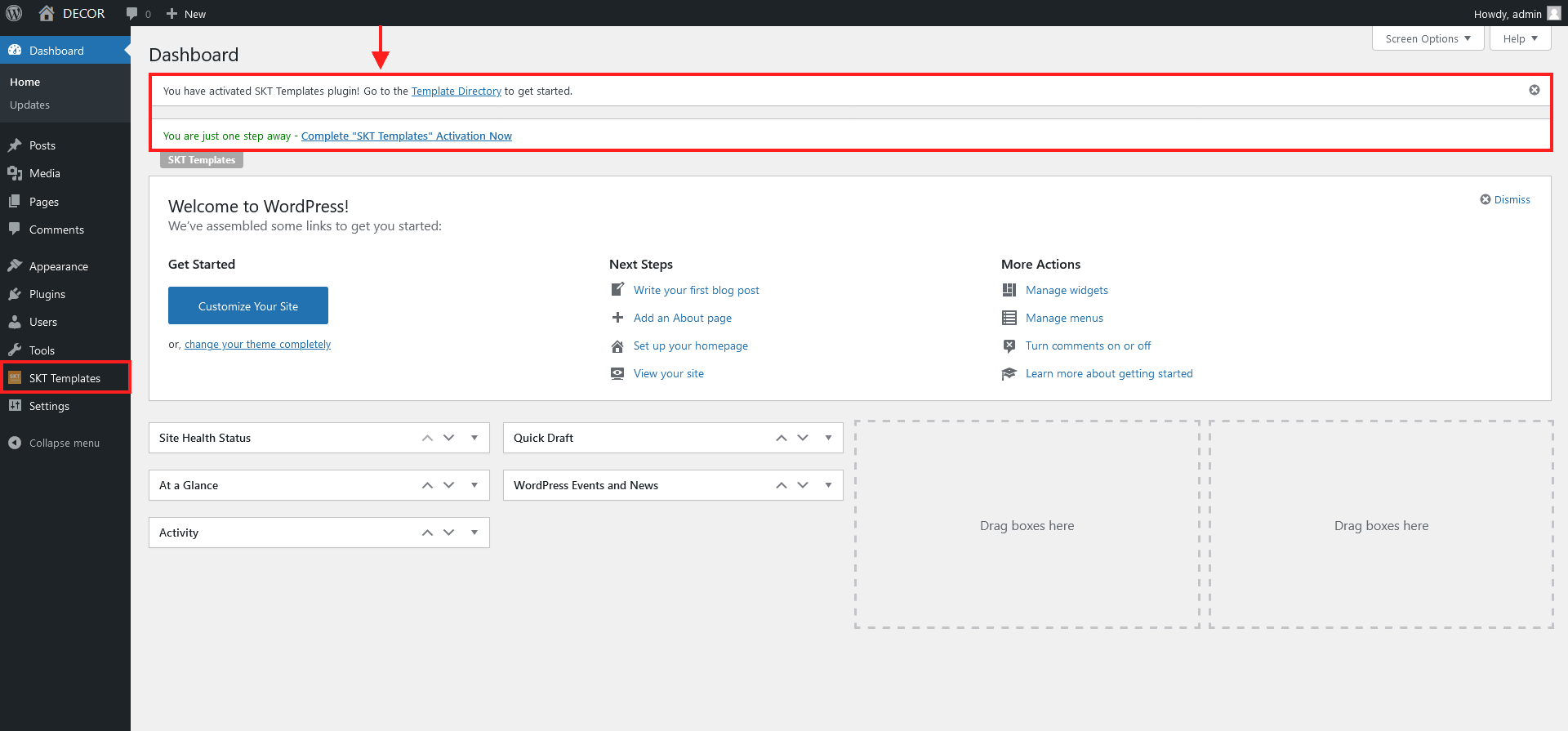 • After activating theme on screen comes "Thank you for installing SKT Decoration!" popup message which says "Install the SKT Templates" plugin which is required for theme. So simply click on "Begin installing plugin" and follow further bellow steps.