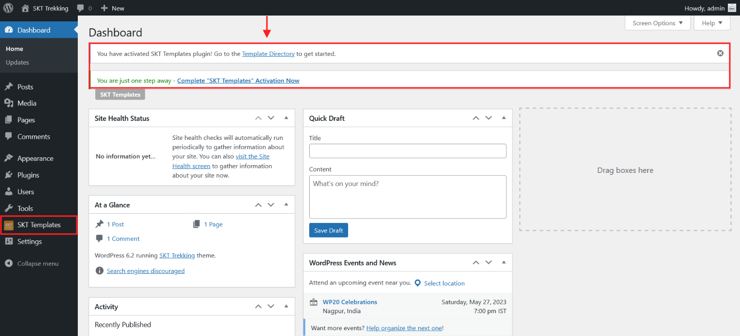 - After activating theme on screen comes "Thank you for installing SKT Trekking!" popup message which says "Install the SKT Templates" plugin which is required for theme. So simply click on "Begin installing plugin" and follow further bellow steps.